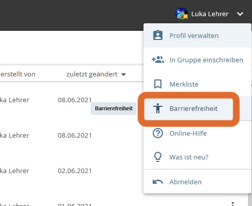 Die Optionen zur Barrierefreiheit können im Nutzermenü eingestellt werden.