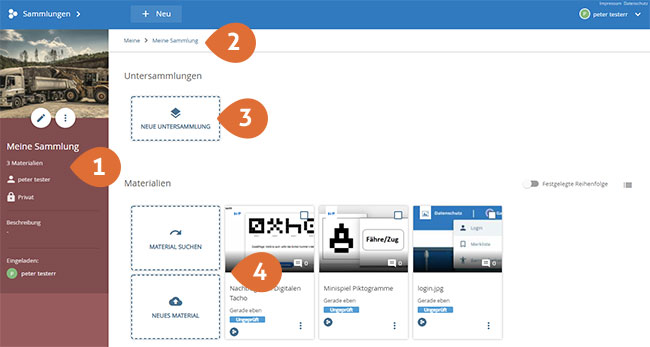 - Untersammlungen der aktuell gewählten Sammlung und Schaltfläche zum Anlegen neuer Untersammlungen