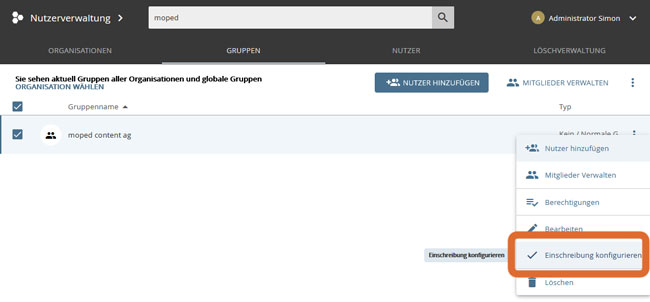 Nutzen Sie die Suche, um die gewünschte Gruppe zu finden und öffnen Sie das Kontextmenü. Wählen Sie die Option "Einschreibung konfigurieren".