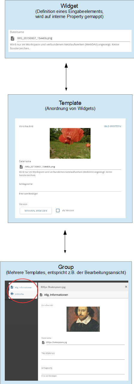 (Endpunkt: GET /mds/v1/metadatasetsV2/{repository}/{metadataset})XML{ widgets:[ {type:"text",label:"Name",id:"cm:name"}, {type:"singleoption",label:"Eine Auswahl:",id:"cm:some_dropdown",values:[{id:"1",caption:"Test 1"},{id:"2",caption:"Test 2"}]}, ], ...Für das Bearbeiten und Anzeigen von Metadaten gibt es "templates", die z.b. die einzelne Reiter eines Tabs darstellen können. Das Template besitzt einen HTML-Angelehnten , wobei die zuvor definierten Feld-ID's als Pseudo-HTML Elemente verwendet werden.
