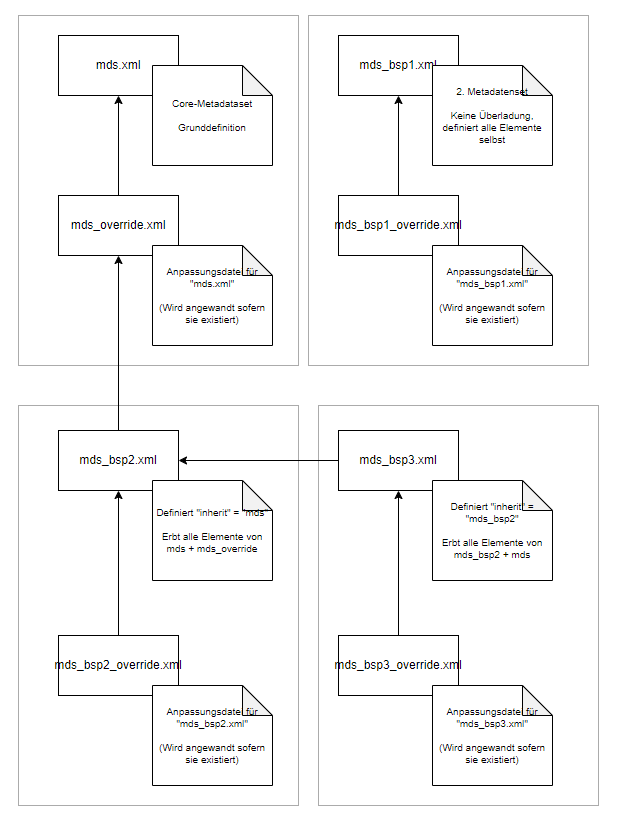 Metadatensets können überschrieben werden, indem eine xml mit dem postifx "_override" und gleichen Namen verwendet wird (für Main Repo mds_override.xml, für weitere Mds den jeweiligen Namen mit verwenden: mds_example.xml -> mds_example_override.xml).
