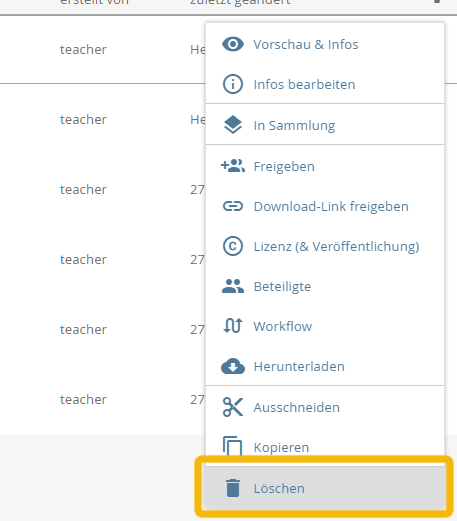 Öffnen Sie das Kontext-Menü () das gewünschten Objektes. Wählen Sie im Menü die Option "Löschen".