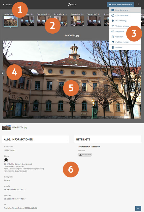 Sie werden in die Einzelansicht des Objektes weitergeitet. Objekte die im Browser dargestellt werden können, (Bilder, Audio, Video) werden direkt geöffnet. Objekte für die dies nicht möglich ist (z.B. CAD-Formate), werden als Download angeboten.
