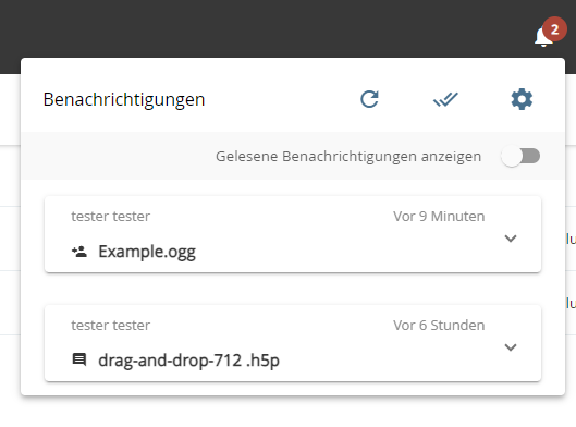 Die aktuellen Benachrichtigungen werden durch das Glockensymbol neben dem Benutzerprofil angezeigt. Die rot hinterlegte Zahl entspricht der Anzahl der noch nicht gelesenen Benachrichtigungen.