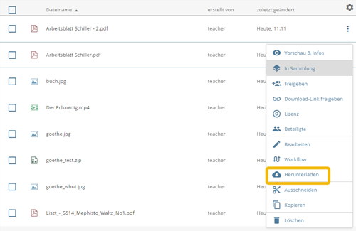Nutzer mit ausreichenden Zugriffsrechten können in edu-sharing gespeicherte und hierfür geeignete Objekte herunterladen.