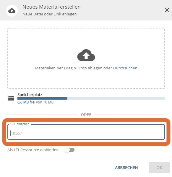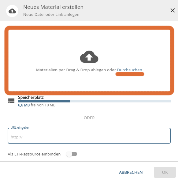 Es öffnet sich ein neues Fenster, klicken sie auf die Schaltfläche "Materialien per Drag&Drop...". Ihr lokales Dateisystem wird in einem neuen Fenster geöffnet.