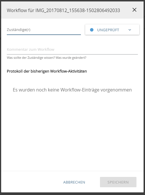 Das Feld "Protokoll der bisherigen Workflow-Aktivitäten" enthält als eine Art Archiv alle Änderungen der Felder "Zuständiger", "Status" und "Kommentar".