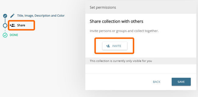 When creating a Collaborative Collection or editing collections other than Editorial Collections, a window opens with a button to invite users.