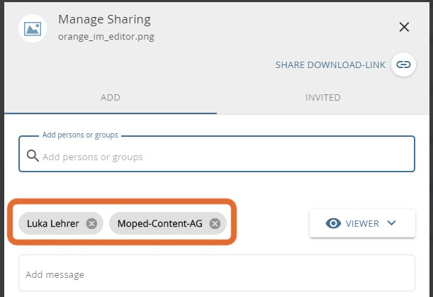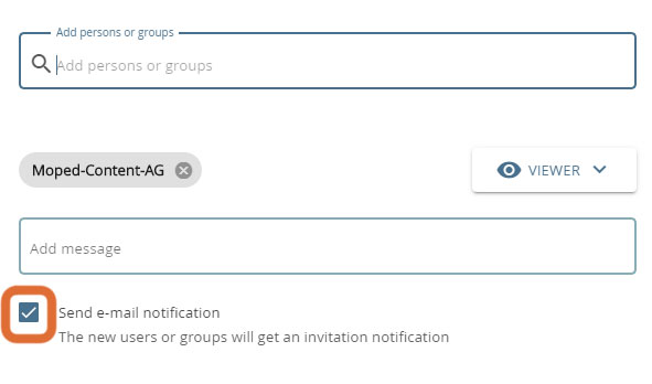 After the invitation, users receive an automated e-mail informing them of the assignment of rights. Alternatively, you can write a personalized message to the respective person in the "Add message" section.