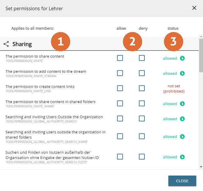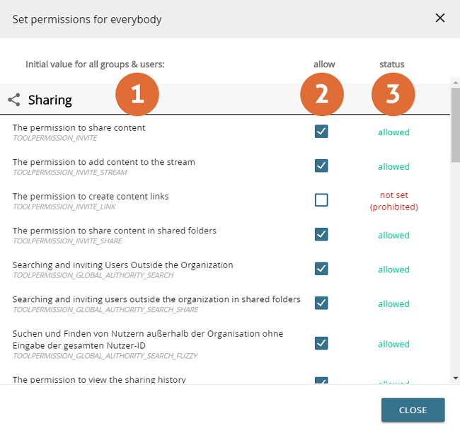 - Buttons to allow the corresponding function - Not set global permissions work like a prohibition, but - unlike explicit prohibitions on the organizational, group and user level - can be overruled by an explicit permission.