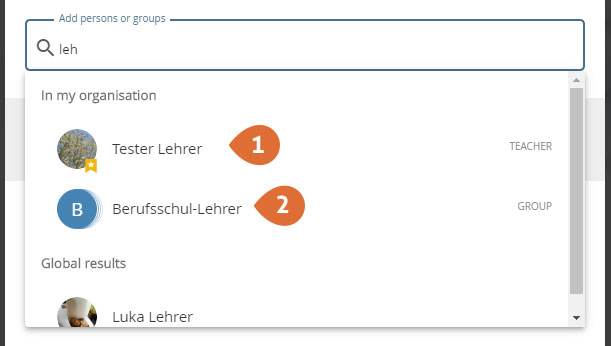 An icon in front of the suggestions shows whether it is a group or an individual user