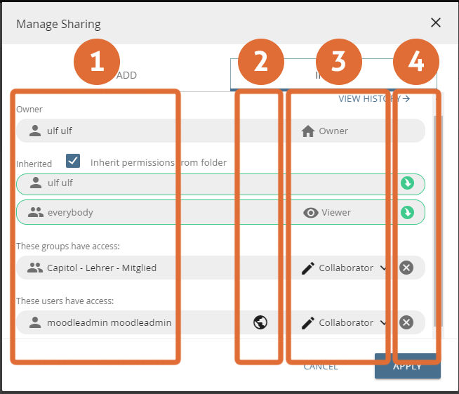 icon): Rights for an object can be assigned either directly to the object (in the "ADD" tab) or by the "inheritance" of rights of parent-folders.