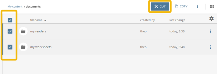 Select the desired folder in the content pane. To do so check the boxes on the left side of the corresponding rows. To select all folders in the current folder check the box above the content pane. Click on the “CUT” button above the content pane.