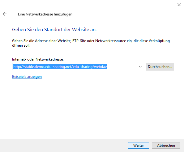 Saisissez l'adresse WebDAV (par ex. http://meinedomain/edu-sharing/) et cliquez sur "Suivant".