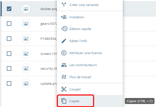 Dans le volet Contenu, sélectionnez les dossiers à copier. Pour ce faire, cochez la case au début de la ligne des dossiers souhaités. Pour sélectionner tous les dossiers du réferentiel, cochez la case située en haut à gauche de la zone de contenu. Cliquez maintenant sur le bouton d'accès au menu déroulant situé en haut à droite de la zone de contenu (). Choisissez ici l'option "copier".