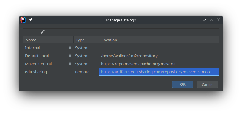 or add it by clicking on "Manage catalogs..." the remote location is http://artifacts.edu-sharing.com/repository/maven-remote