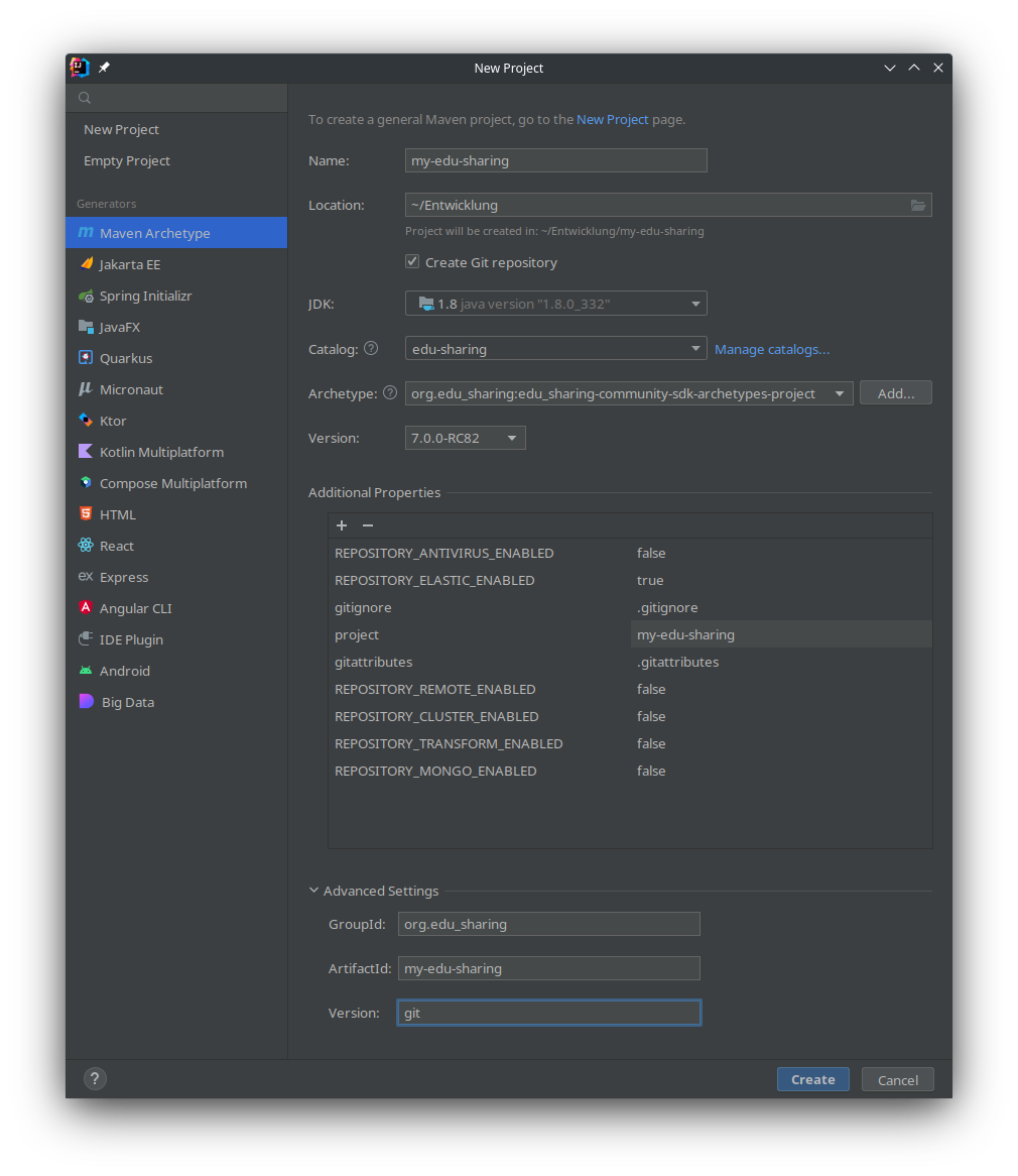 - In the archetype drop down menu select org.edu_sharing:edu_sharing-community-sdk-archetypes-project