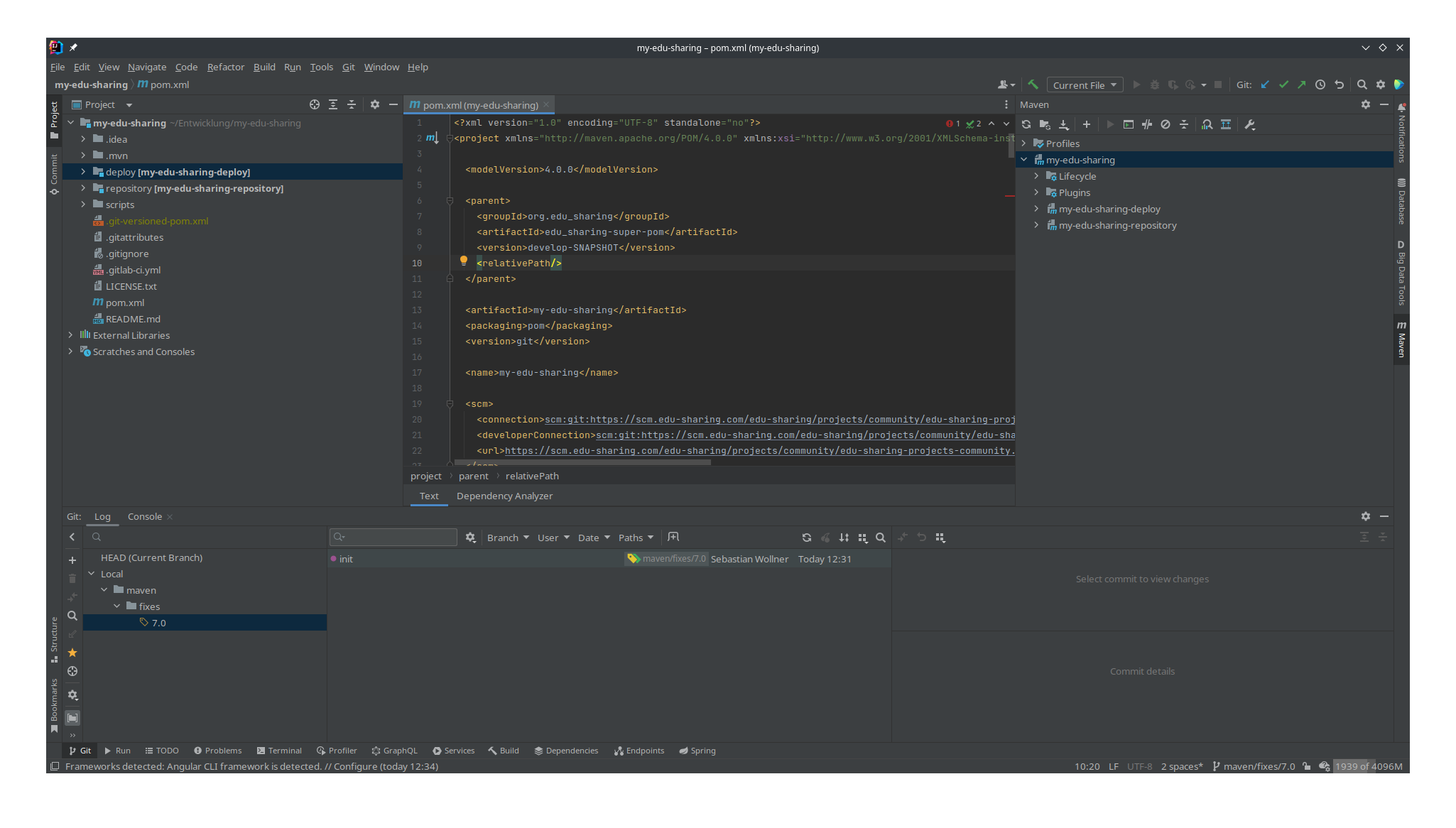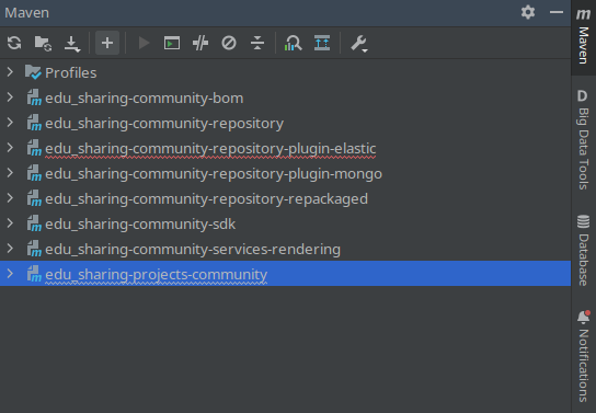 - You can now run maven install to build the project. To do so open the maven tab on the right and right click on my-edu-sharing (project name) and click on "Run Maven" → "install"