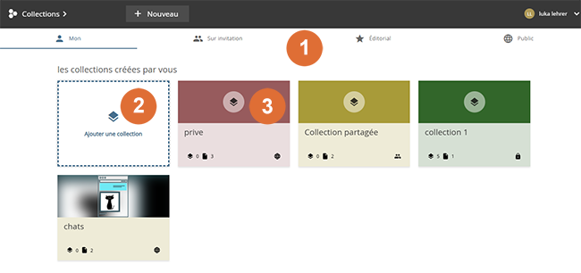 1. Navigation par types de collections - Passez des collections que vous avez créées vous-même (MON) aux collections partagées avec vous ou vos groupes (SUR INVITATION), aux collections éditoriales ou aux collections visibles par tous les utilisateurs (PUBLIC).