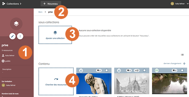 Vous pouvez créer des collections/Sammlungen erstellen  privées et publiques ou limiter la visibilité à votre organisation (par ex. école).
