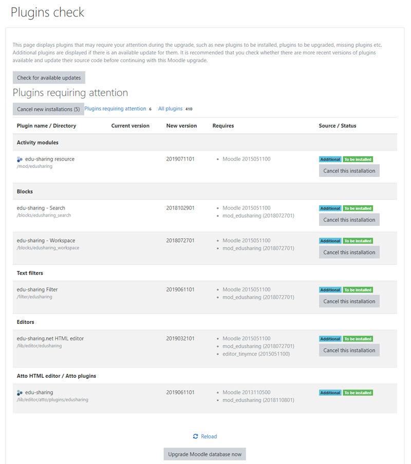 Si vous n'êtes pas redirigé, ouvrez "[Moodle-install-directory]/admin/" dans votre navigateur. Vous obtiendrez une liste des plugins d'edu-sharing que vous venez d'installer.
