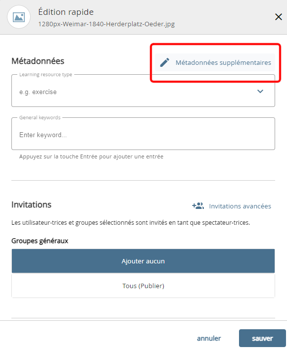 Métadonnées section "Édition rapide" avec lien vers " Métadonnées supplémentaires ".