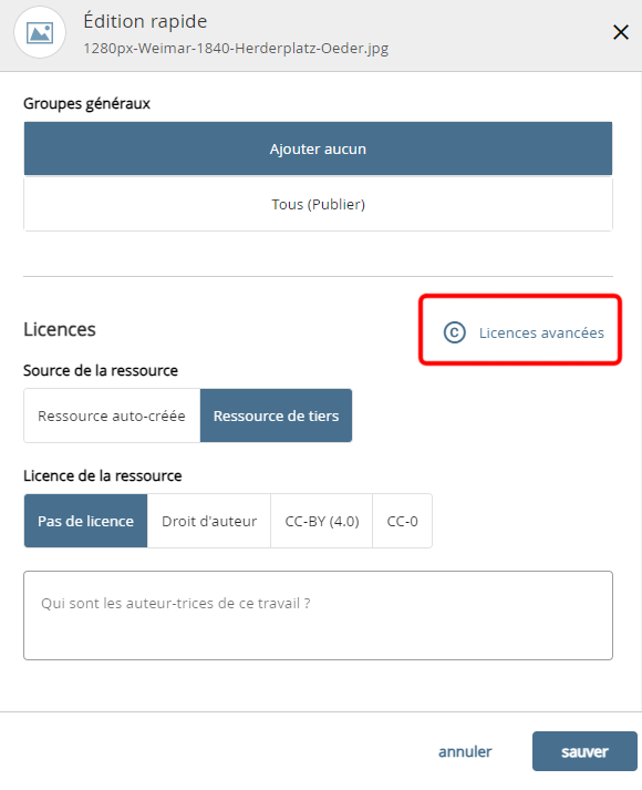 - Dans "Ressource auto-créée", toutes les données d'auteur nécessaires pour les licences Creative Commons sont automatiquement remplies avec vos données.