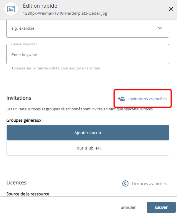 Pour saisir d'autres autorisations plus détaillées, cliquez sur le bouton "Invitations avancées" en haut de la rubrique.