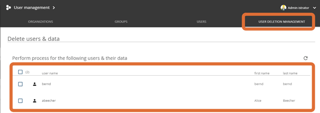 Liste der zur Löschung markierten Nutzer in der Löschverwaltung