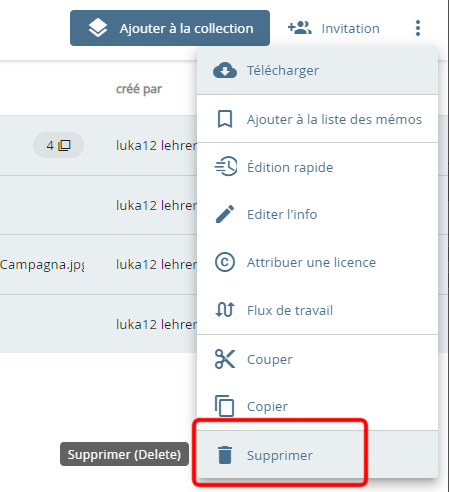 Menu déroulant avec option "Supprimer"
