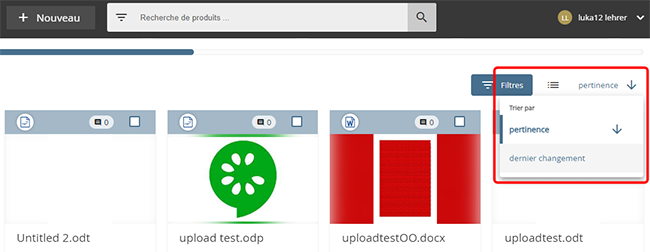 Sélectionnez le mode de tri souhaité en cliquant dessus. Une flèche derrière l'option indique le sens de tri actuel (par ex. « dernière modification » décroissant ). Cliquer plusieurs fois sur la même option change le sens de tri de l'option sélectionnée.