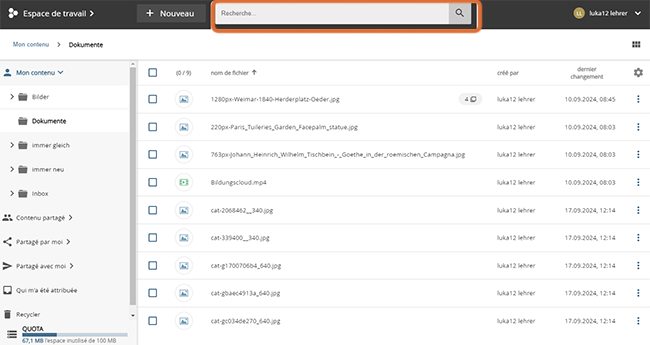 Le terme de référence est recherché dans les métadonnées (p. ex. titre et description) des objets enregistrés. Pour les documents contenant du texte (p. ex. Office, OpenOffice et PDF), le terme clé est également recherché dans le contenu réel des documents. Les résultats de la recherche apparaissent dans la section Ressources.