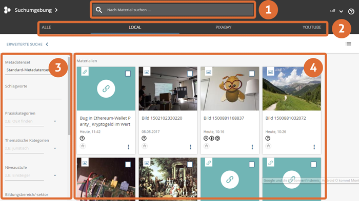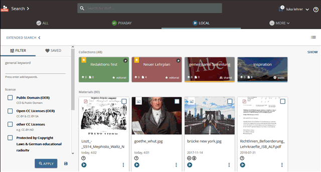 Le moteur de recherche edu-sharing offre les fonctions les plus étendues. L'utilisateur dispose ici de fonctions de recherche avancées. La recherche edu-sharing peut par exemple être intégrée dans le site web des organisation utilisatrices en tant que recherche publique OER.