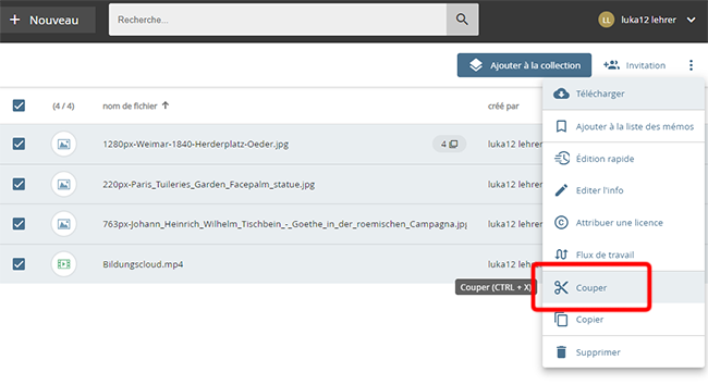 Connectez votre ordinateur à edu-sharing via WebDAV. Copiez les objets souhaités dans le presse-papiers en fonction de votre système d'exploitation et collez-les à l'endroit souhaité.