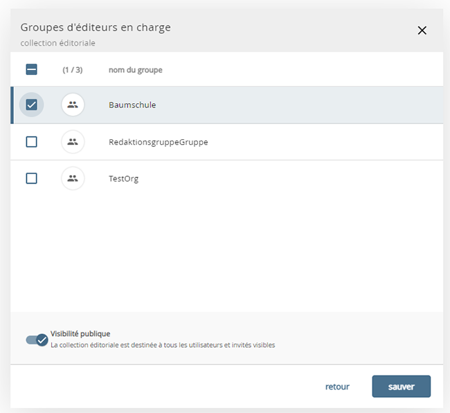Ces collections sont gérées par un ou plusieurs « groupes de rédaction ». Les membres de ces groupes peuvent être choisis comme « responsables » des collections éditoriales. Les membres de ces groupes disposent de droits de collaborateurs sur les collections.